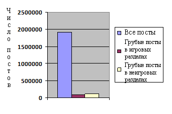 Чтобы определить грубость продотеров, мы просканировали все их сообщения, используя списки нецензурных слов для онлайн чатов. В итоге мы видим, что каждый 10 пост на форуме содержит грубую лексику. При этом маты используются одинаково как в игровых, так и в неигровых разделах.
