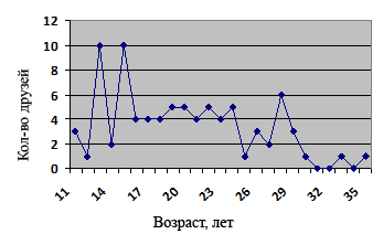 Как вы знаете, на форуме есть опция добавления друзей. Мы решили проверить востребованность данной функции. Из графика видно, что среднее число друзей не превышает 4 на одного юзера. Кроме того, больше всего друзей имеют пользователи в возрасте до 17 лет, а из первого графика мы узнали, что эта возрастная группа составляет менее 10% всех продотеров. Получается, что функция добавления в друзья не нужна юзерам.