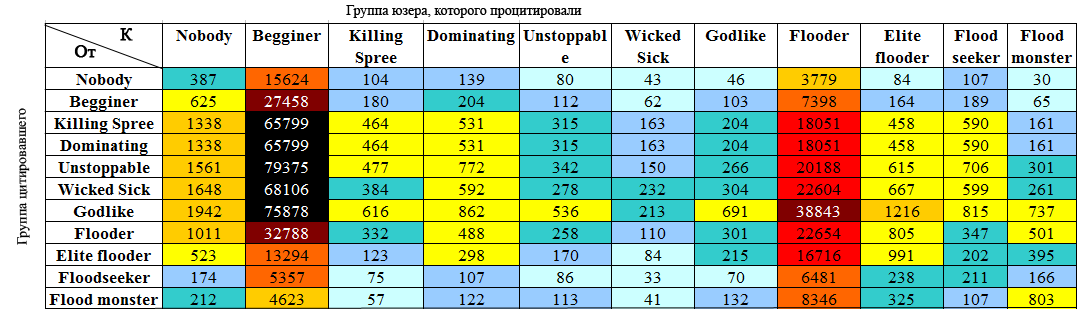В конце исследования мы решили проследить взаимодействия между разными группами юзеров. Для этого мы заполнили таблицу, которая показывает количество цитат между пользователями. Ячейки таблицы были раскрашены в зависимости от количества цитат – от синего (мало) до черного (очень много).