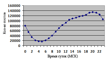Затем мы изучили активность юзеров в зависимости от времени суток. Ничего необычного – пиковая активность наблюдается с 19 до 22.00 по Москве.