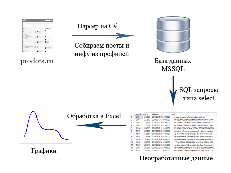 Если кому-то интересно как проводилось исследование, то ниже привожу схему сбора и анализа данных. Код на С# довольно прост для тех, кто хоть немного знаком с программированием.