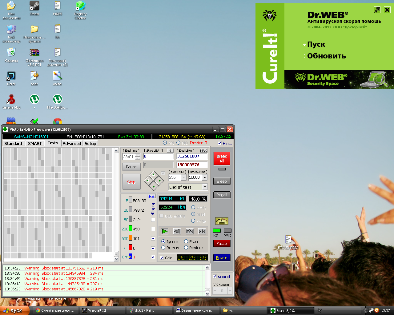 KOLYA_NOOB1995 #60 12 июня 2012 (изменено) закончился тест виктории? а увидел, 48%ну поидее один сектор не так страшнобля надобыло ремап галочку ткнуть :D, а не игнорну я думаю похуй add: хотя недавай кароче, пусть проверка закончится на виктории, по идее у тебя 1 сектор должен быть, + он в началепотом опять запусти викторию>>>>>>тестс>>>>>галочку ремап ставь, как поставишь, старт, когда найдет этот сектор и исправит, можешь стоп нажать после этого проверяй доктор вебом, если вирусов нет, будем искать где восстановление винды Изменено 12 июня 2012 пользователем KOLYA_NOOB1995 Цитата Поделиться сообщением Ссылка на сообщение