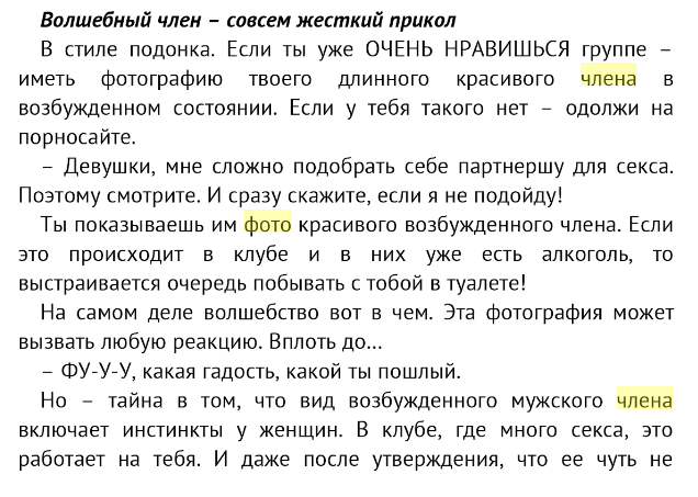 Nayon #6047 23 августа 2016 Бля помню на 1-м курсе читал две книжки Лесли, ну вот его первую самую и че-то там угнать за 60 секунд что ли или как-то так. Читаю посты фб про телок и прям пиздец как напомнило этого Лесли. Все те же слова, вся эта хуйня про игру, про зацепы, там фотку хуя показать и все такое. У Лесли новые книги-то выходили или, фб, ты еще по той старой? а точно, жизнь без трусов она называлась.дак фотку хуя это не троллинг что ли? :lol: нет плз, скажите что это шуткаТам вроде основная фишка даже не фотку хуя показать, а вообще хуй. Ну там типа без палева раздеться и щеголять с голым хуем перед бабой, мол тебе жарко. – Уникальная возможность подвернулась мне сегодня классно покататься с ветерком в приятной компании. Хотите, я тоже прокачу тебя (вас) с ветерком? На эскалаторе? – Это платье на вас выглядит великолепно. Ну, вообще-то, и я бы на его месте выглядел не хуже. – Можно вам привет передать? Привет! – Вау, ни фига себе? Вот это да-а-а! (Когда тебя о чем-то спрашивают, используй эту конструкцию при ответе на любой вопрос. Она очень хорошо развивает коммуникацию и вносит элемент удивления и неожиданности.) – Угадай, какой у меня знак зодиака? – Хм… Рак? – ВАУ! НИ ФИГА СЕБЕ! ВОТ ЭТО ДА! – Я угадала? – НЕТ! В мои цитаты Поделиться сообщением Ссылка на сообщение
