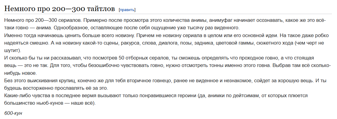 pushstrat #13581 В четверг в 15:01 Согласен, очень крутой тайтл. Элементы мета-кино, что он днем ояш, а ночью крутой эджлорд. Это как Оверлорд, где его шестерки всё за него делают и даже думают за него, только немного лучше. Можно сказать, что в этом и суть, и это «деконструкция» жанра, но большинство подобных произведений купаются практически во всех недостатках, ослабляют сильные стороны жанра, над которым подшучивали, и не добавляют почти ничего нового. Цитата Пропаганда флекса Легенда украинского хоккея суперегуляр Поделиться сообщением Ссылка на сообщение