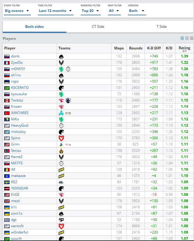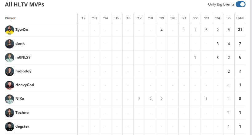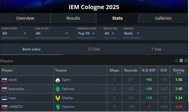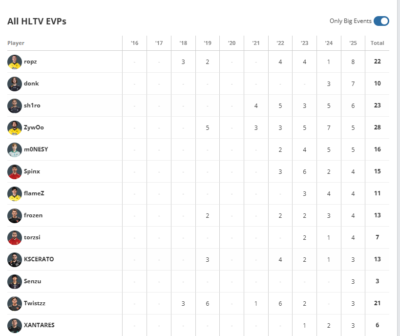 PIXMELLo #10125 11 часов назад https://www.hltv.org/stats/leaderboards?startDate=2025-01-01&endDate=2025-12-31&matchType=BigEvents&rankingFilter=Top10 вот такое есть, можно мажор ставить че угодно на один клатч илюшу обогнал, с амплуа люркера + закрывашки Цитата Поделиться сообщением Ссылка на сообщение