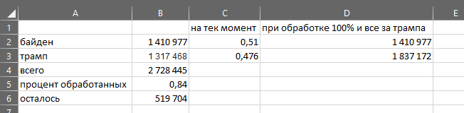 в Аризоне камбек пошел. У байдена было 130 тыс. преимущества (когда подсчитали 82%), теперь осталось 96 тыс. (на 84%). Но осталось ещё 500-600 тыс. голосов, из которых красных голосов больше, чем синих .