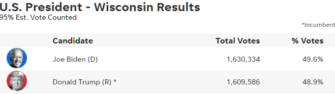 В Висконсине на 99% голосов лидирует Трамп на 0.7%