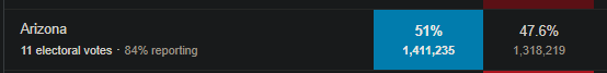 Неее, аризона точно конец. Там ток кокшис округ (где низкий процент) за трампа, а там мало людей. Там пиздец уничтожение будет, основная масса людей в этих 10-20% сидит в жесткосиних округах.