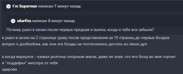 I'm Superman #3796 1 ноября 2021 sAw#ics написал 1 минуту назад: тогда ты должен увидеть, что я уполз на 2 и выполз где-то на 30-35 что тогда значит твое "выполз, когда о тебе забыли", если я выполз прям как раз тогда, когда обо мне только вспоминать начали с твоих же слов? ты просто пиздаболище а мжи не врут Ты только что писал, что выполз на 15, теперь на 30-35, когда я указал на твой пиздеж И после этого выполз только перед ночью и начал с Мессором ругаться Поделиться сообщением Ссылка на сообщение