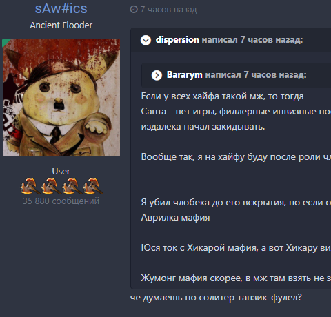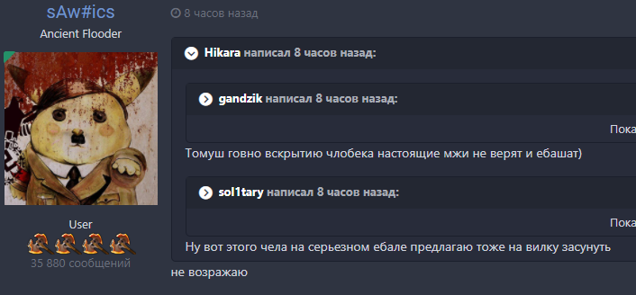 Bararym #6077 1 ноября 2021 sAw#ics написал Только что: @Bararym офк не было кандидатор кроме пидерсии офк не было кандидатор на переворот кроме санты, сосеча и хуй пойми кого вы там высрали молодец, ты для чего это кидаешь? я тебя не вижу мафией тут Поделиться сообщением Ссылка на сообщение