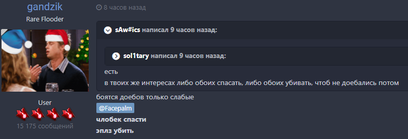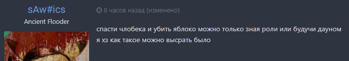 pnanrkotikivj #6080 1 ноября 2021 wisp74rus написал Только что: pnanrkotikivj написал Только что: wisp74rus написал 3 минуты назад: pnanrkotikivj написал 4 минуты назад: wisp74rus написал 5 минут назад: Это так, но лионель написал 0 мж постов но ты тоже Я не с финтом как минимум по нашему диалогу, когда сливал его так что ты не прав, один наберется у тебя исходная не та Ты спросил про мж пост, я тебе написал, что он есть я тебя мафией ни в едином моменте игры этой не рассматривал Что было вчера... то забыть мне пора ...but then Поделиться сообщением Ссылка на сообщение