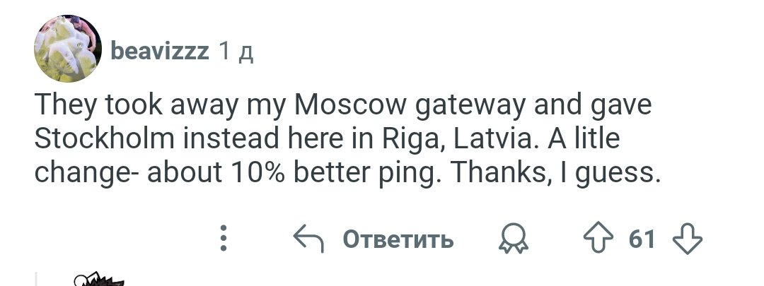 NaxrenApm #29557 17 ноября Ну у меня мск пинг 0, а стокгольм 70-80 такое себе на замену. Пришлось на предиктив перейти. Мск, мгтс. Цитата Поделиться сообщением Ссылка на сообщение