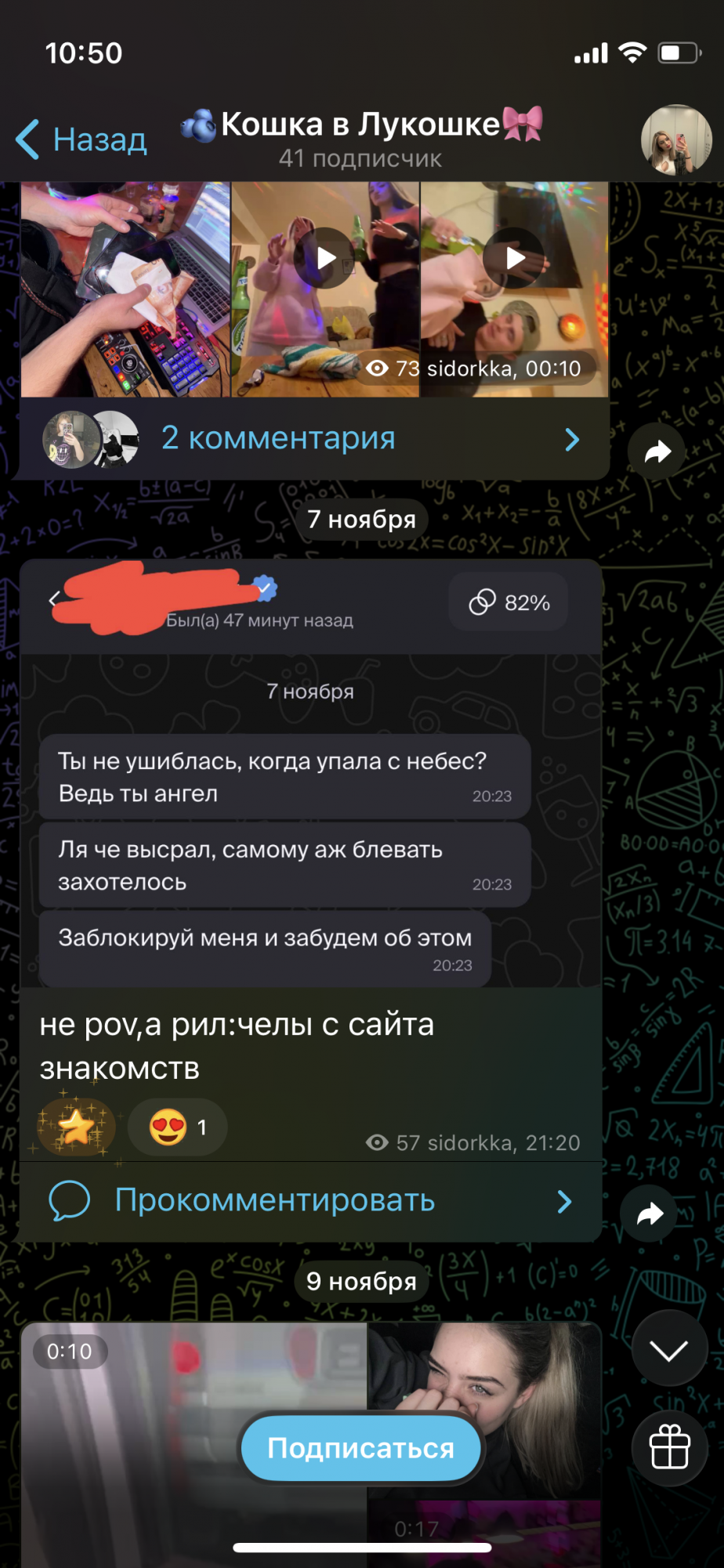 Qreeq #48808 18 ноября 2025 MotorShoW написал 4 часа назад: >>>заходишь в мэтч >>>у нее ссылка на тг >>>в тг ссылка на канал с 40 подписчиками >>>тебе плохо >>>видишь пост о парнях с сз >>>тебе хуево Хз всегда считал бабье с сз со своими каналами ебнутыми созданиями с потребностью во внимании Видишь кучу фоток с разными мужиками >>>не ну я то точно тот самый Имя канала на скрине залетайте в комменты Так сообщения от чела реально аутизмом провоняли насквозь Цитата Поделиться сообщением Ссылка на сообщение