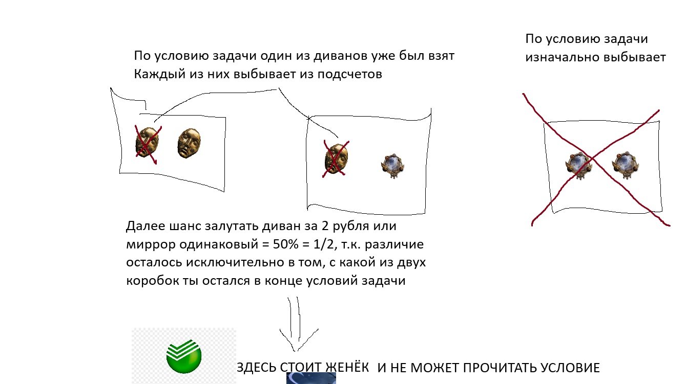 привет, мне не похуй что в этой коробке, если в этой коробке есть золотой. Ты слышал про квантовую запутанность? Третья коробка существует только номинально, если ты ее выберешь, то она превращается в коробку 1 или коробку 2, и коробка 1 или 2 превращается соответственно в третью. Таким образом выбор третий вроде как и возможен, но это никогда не будет коробкой с 2 серебряными. Я думал ты эмайти заканчивал и должен понимать настолько простые вещи.