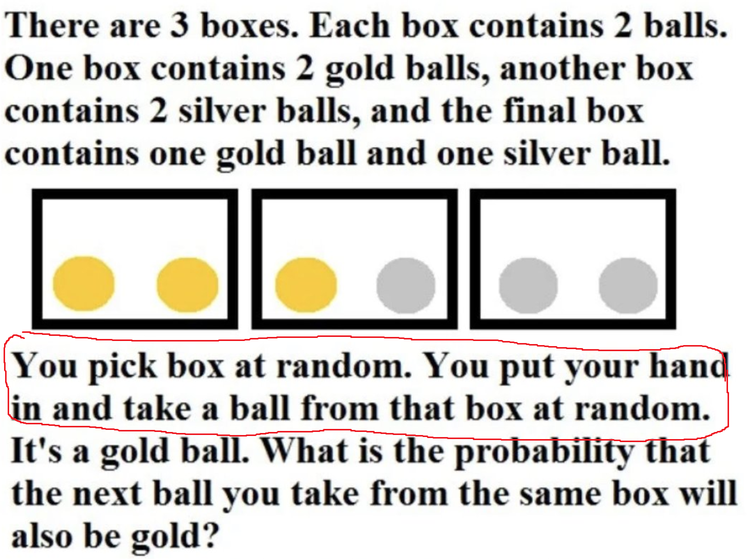 Путаешь. В условии написано, что рандомный золотой шар тянется из рандомной коробки. Эту формулировку я позаимствовал у @Ritsu twit бтв (вроде бы он первый примерно так сформулировал), т.к. считаю её максимально правильной и лаконичной.