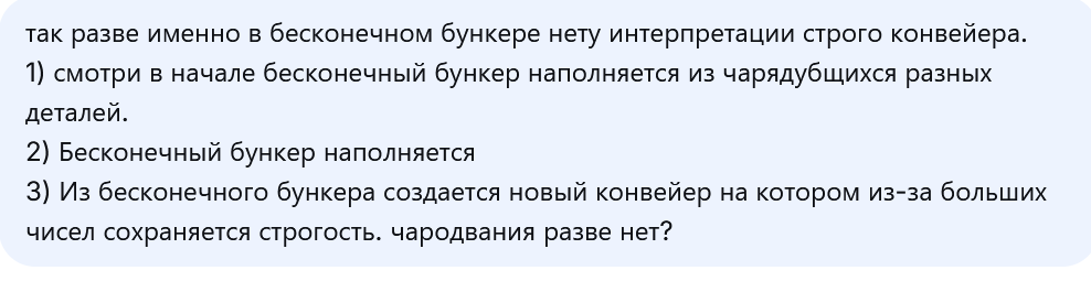 Так дискуссии нет. Ты засрал боту оперативную память какой-то хуйнёй, получил отличный от 5/6 ответ и хочешь, чтобы я с тобой это обсудил? Я тебе предлагаю сформулировать задачу боту одним запросом и запостить сюда его ответ. Тебе сложно это сделать или ты боишься, что без твоих стикеров и прочего говна бот не сможет понять глубину твоей шизофрении?