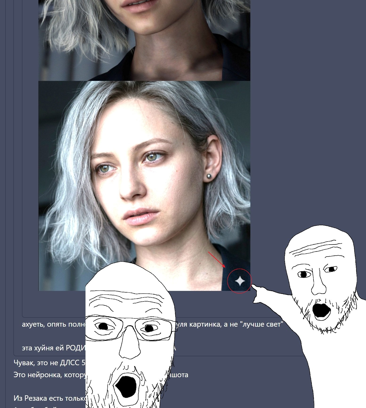 Sanek_Night #10047 17 марта Kant написал 3 часа назад: Rooster написал 3 часа назад: Показать содержимое ахуеть, опять полностью перерисованная с нуля картинка, а не "лучше свет" эта хуйня ей РОДИНКИ БЛЯТЬ НАРИСОВАЛА Чувак, это не ДЛСС 5 Это нейронка, которую хуйнули поверх скриншота Из Резака есть только 3 сцены 1 - с бимбой-унитазом, которую все форсят 2 - с ней же, но её не форсят, т.к. мемного потенциала нет, да и выглядит лучше, чем натив 3 - с Леоном. Её тоже не форсят, т.к. там всё выглядит хорошо Все 3 по ссылке https://www.nvidia.com/en-us/geforce/news/dlss5-breakthrough-in-visual-fidelity-for-games/ Цитата Скрытый текст Поделиться сообщением Ссылка на сообщение