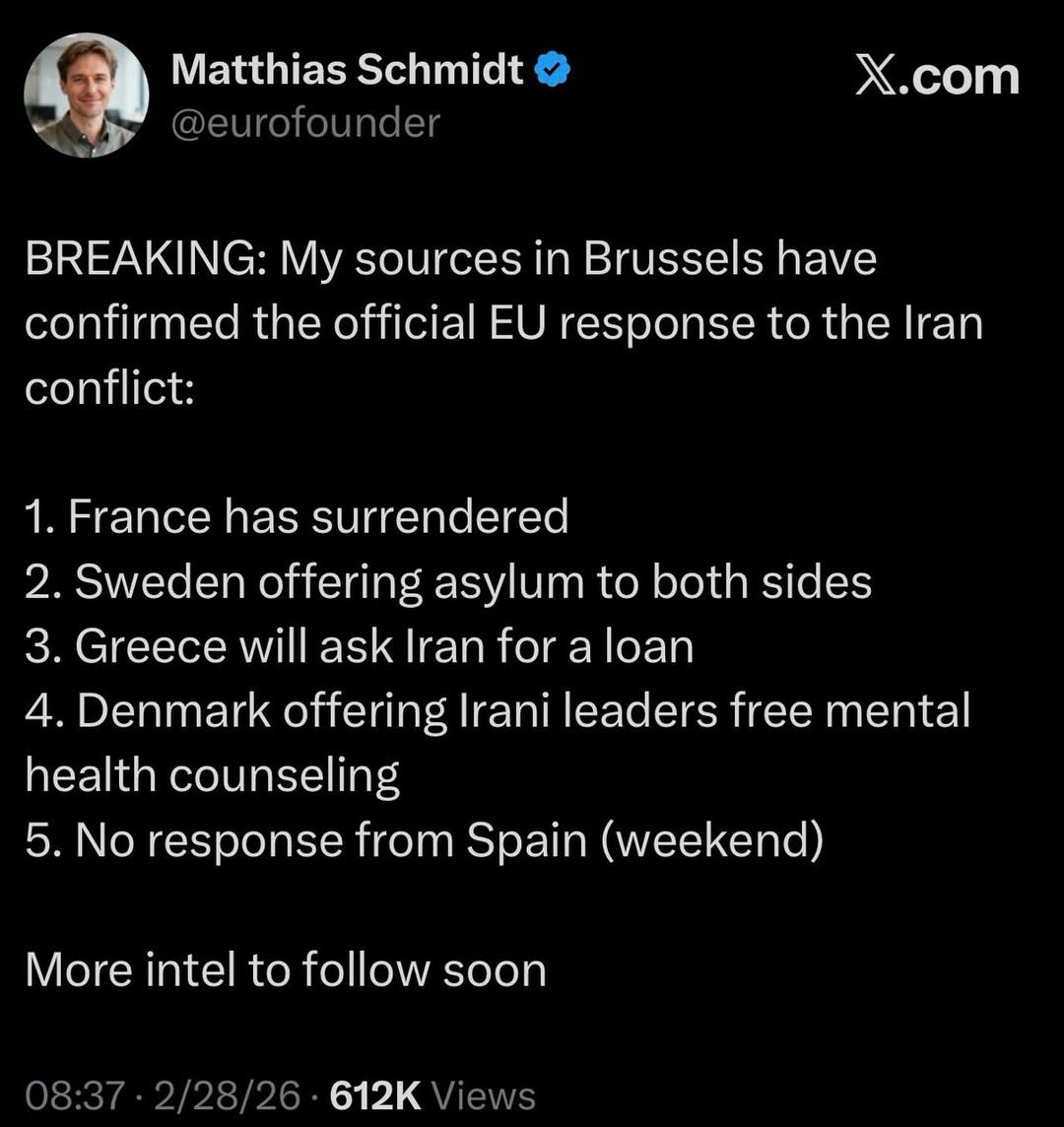 Kant #12414 1 час назад ну про францию всегда смешно и самый сок шутки, что он не написал про респонс эстонцев Цитата Торжество разума в том, чтобы уживаться с теми, у кого этого разума нет. Вольтер.Чтобы хорошо высыпаться, нужно спать 8 часов в день. И еще столько же ночью. Поделиться сообщением Ссылка на сообщение