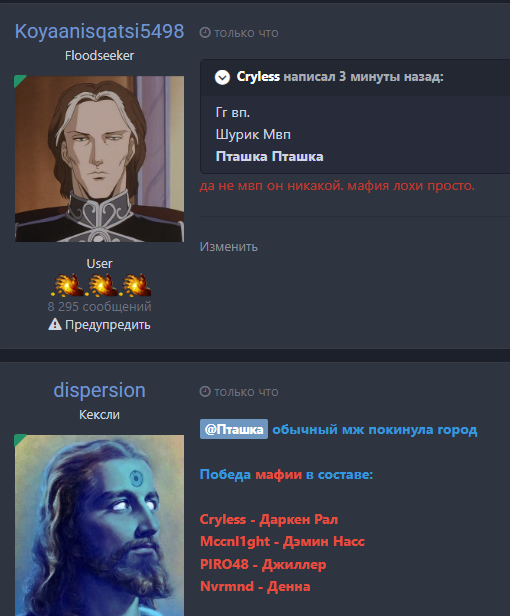Aferus #6278 2 ноября пиздец. ну это было уже на рандоме, на самом деле. по неверу хуй инфы, полуовощ, мы тоже уже устали. чисто да или нет. Шура решил ворваться и попробовать все этой переиграть и перобдумать, но это бесполезно, когда ласт игроки уже не играют. точно не его вина. Шурик, ты молодец. я понимаю твою паранойю, я тожев Пташку парнойил. но тут просто сучливая афк игра пловины тредов, особенно мафов. и мы устали Цитата Поделиться сообщением Ссылка на сообщение