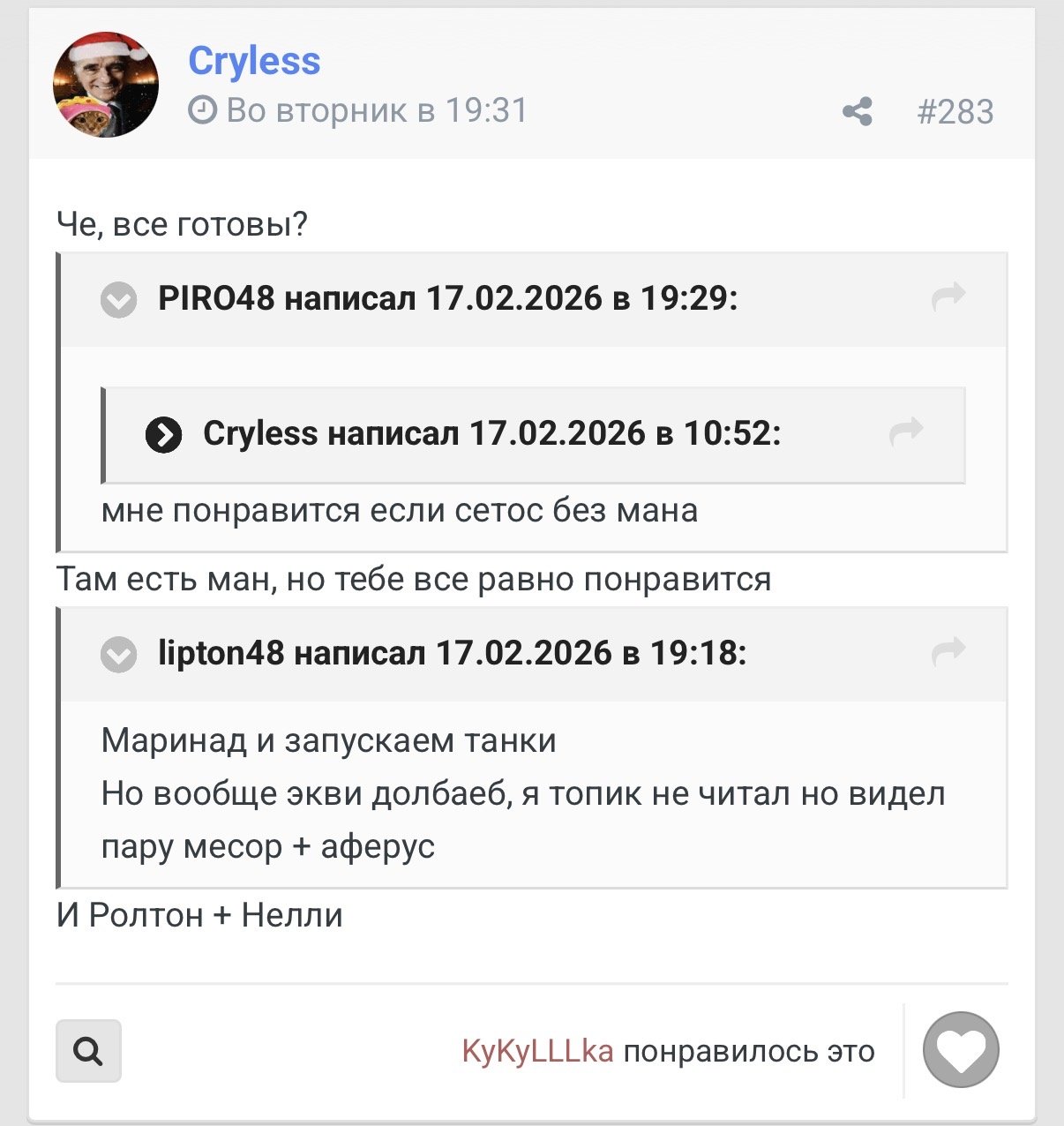 Adler34 #12657 Во вторник в 11:36 R0ss0ha написал 22.02.2026 в 07:34: @Adler34 как там игра на д2ру с твоими подписчиками? Получити Ещё 1 человек нужен, а то Соня может будет, а может нет Цитата Поделиться сообщением Ссылка на сообщение