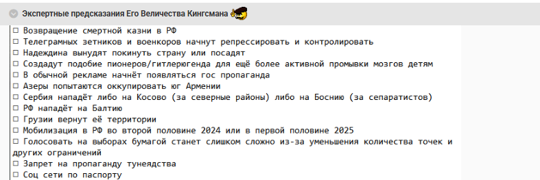 Kingsman #397 3 сентября удивительный болтун конечно, несколько подкастов видел, впечатлило что так возможно работать языком. с таймингом известности не повезло, щас в рфии надо сидеть тихо и не высовываться Цитата Экспертные предсказания Его Величества Кингсмана Поделиться сообщением Ссылка на сообщение