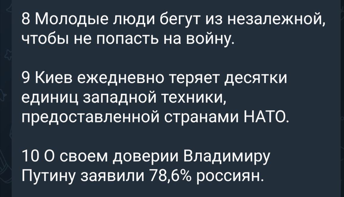 Cказал Трамп Мерцу, Макрону и Путину, что, сколько они на лошади прoскачут по полю — вся та земля их. Ну, скачет Мерц час, два, оглядывается назад — "Эх, да этого же и мне, и моим потомкам на всю жизнь хватит!" Поскакал Макрон... час, два, три, четыре — потрогал лошадь, "Ан нет, лошадь устала, и земли мне этой хватит". Кульминационный момент — скачет Путин. Час, два, три... сутки, вторые пошли, лошадь обессиленная уже падает, он встает и бежит-бежит-бежит, но силы покидают его, и он падает навзничь на землю, снимает пынеходы и кидает их вперед, с криком "А це — пiд помидоры!!"