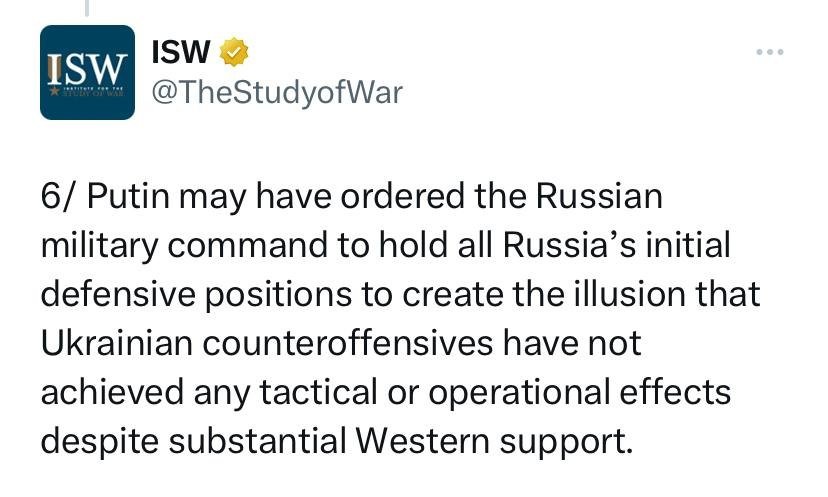 Путин, возможно, приказал российскому военному командованию удерживать все первоначальные оборонительные позиции России, чтобы создать иллюзию того, что Украинские контрнаступления не принесли никаких тактических или оперативных результатов, несмотря на существенную поддержку Запада.
