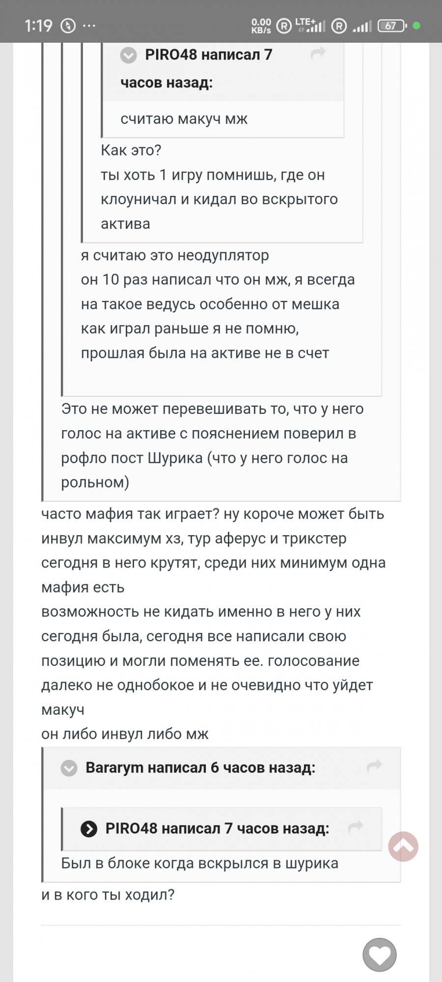 И Макуч подхватил, что типа вот оно, поэтому Аферус голос и поменял. Он маф. Мафы знали что там ман, который их знает и они решили действовать. Но так рисково кинул только я. Помнишь? Лирончик и Екви остались в Макуче. Странно получается. И при этом оно сразу видно, если просто открыть таблу. Мирному идея пришлав голову = проверяет = доносит. Логично? Макуч просто радостно пукнул в тред. Даже ничего не проверяя. А в прошлой на мирном он много чего проверял)