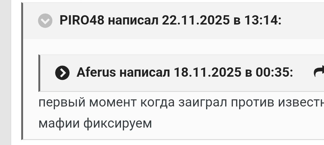 Окей, мне от Диспа пиздец как не нравится гнилая суета вокруг моих опорников + он подозрительно пропадает в ключевые моменты. Аферус напиздел + поторопился вчера с убить + его краснят за актив, но он изи может выдавать актив на черном, он не ссыкич, уверенный игрок и даже дерзкий. Я перечитаю его отдельно, тк он все же лил чбра, это его немного обеляет наверное. Аферус наверное один из самых сложных цветов для меня ща.
