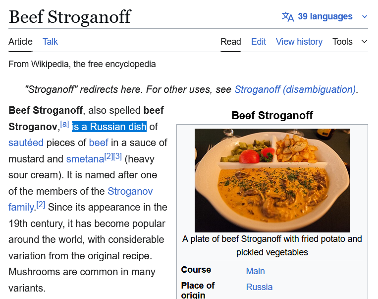 Бефстроганов такая же русская кухня как картошка фри немецкая.