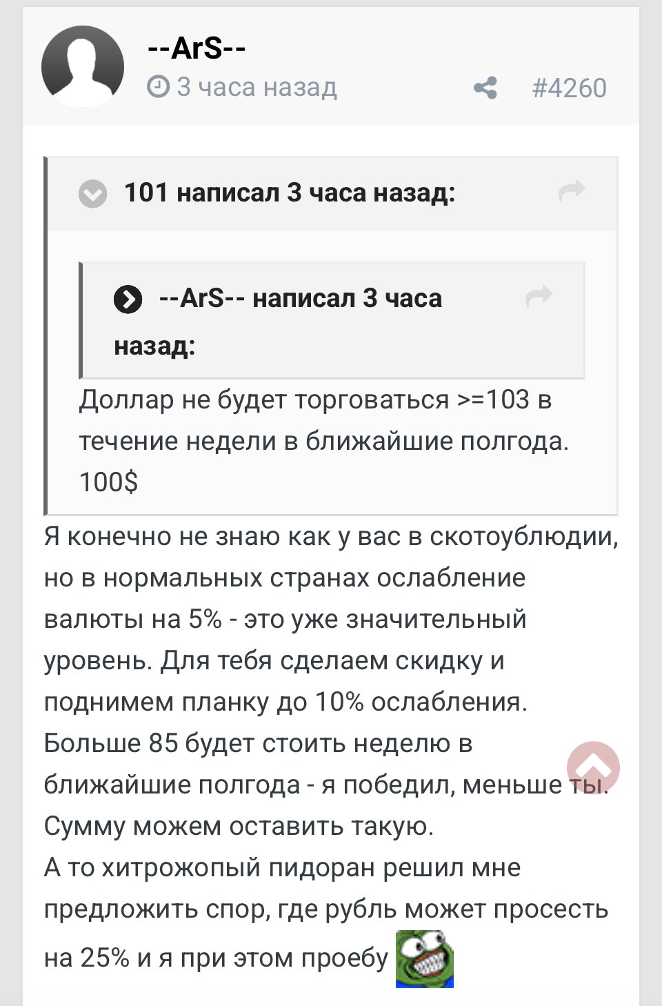 Смысл в том, чтобы один высокомерный туповатый хуесос с ником 101, который любит каждого второго обвинять в пиздеже и воздуханстве, научился бы отвечать за свои слова. А то получается, что я у него напиздел, когда говорил о значительном ослаблении рубля, но спорить он почему-то предлагает на то, что рубль катастрофически наебнется за полгода более чем на треть, что даже на 10р выше, чем планы на весь 26 год в недавно принятом откорректированном бюджете.