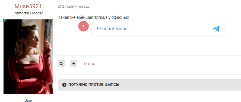 Процитировал пост с нарушением, который был впоследствии отредактирован или удален — отлетел на 7 дней.