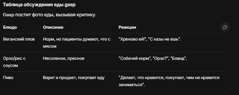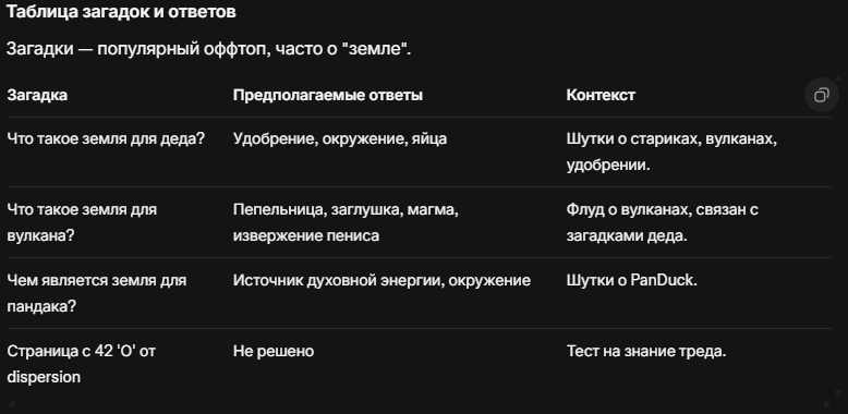 Исследования показывают, что тема полна хаотичного флуда, шуток и оффтопа: от обсуждения еды (критика блюд gasp), здоровья (скрип зубов, психотерапия), до аналогий с психушкой или Россией, загадок ("что такое земля для деда?") и личных историй (работа, дети). Нет явных конфликтов, но много троллинга и мемов, включая повторяющиеся фразы вроде "Я, dispersion, чмырю активов".