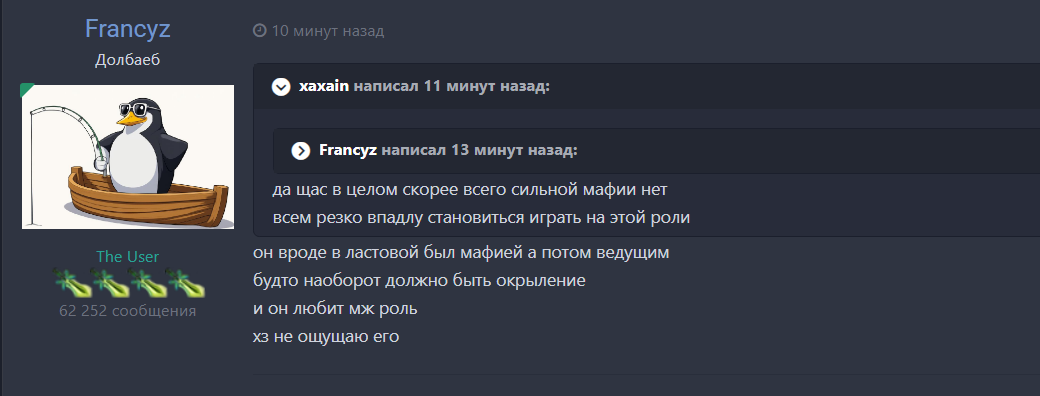 Francyz #212 19 часов назад да и где ту деф я наоборот говорю что он мафия Цитата ^ MAL Поделиться сообщением Ссылка на сообщение