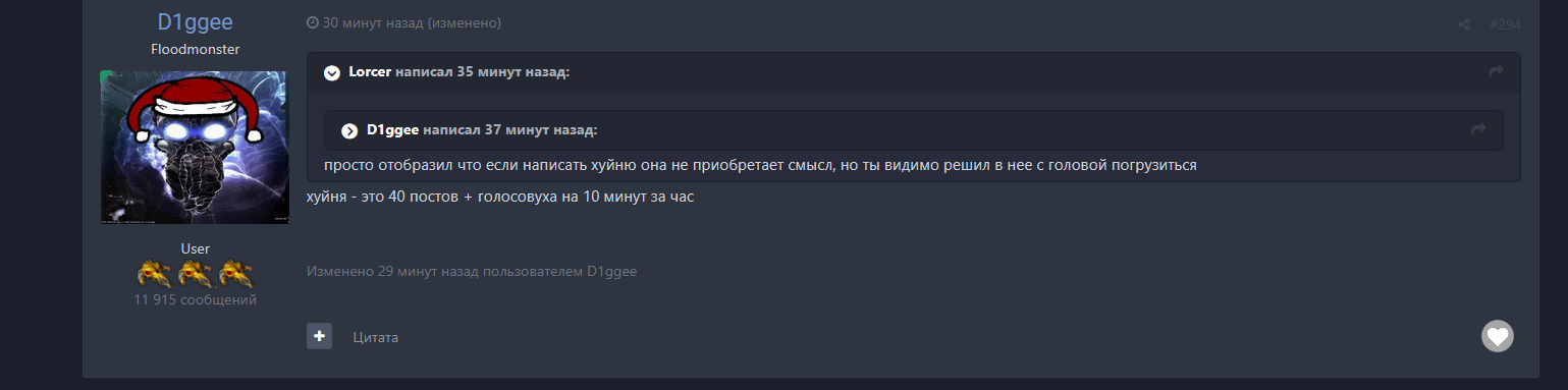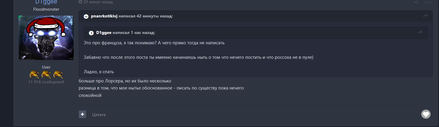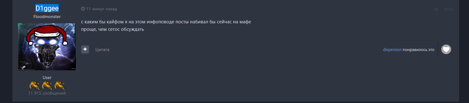 dispersion #417 23 часа назад Всем здравствуйте. Чтобы не было вопросов, заявляю свою позицию настарте: Я — мирный житель. Моя задача — помогать городу анализировать, а не устраивать карусель. Буду задавать вопросы по поведению и логике. Сегодня первый в списке — лорсер потому что агрит на себя весь топик, а в игре на мафии воевал только таргетно, тут же ему будто бы похуй чье внимание стягивать, ах да, еще он вскрылся мирным буквально первыми же постами, я не могу это развидеть, поэтому буду от этого играть. Все мои голоса и подозрения будут здесь, в открытую. Можете меня по ним читать. Готов к диалогу. Задавайте вопросы. Цитата Я, dispersion, чмырю активов(аче они дауны ну?) Скрытый текст Поделиться сообщением Ссылка на сообщение