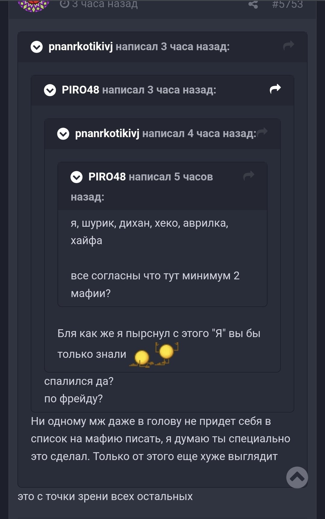 Вы можете возразить, дисперсия, у тебя двойные стандарты, ведь Диниска у тебя мафия, но разъебался об клетку, чтобы ее убили. На что я отвечу - и че блять, это Диниска, ниче не мешало ему послать нахуй план конфы и сыграть в упор нагло.