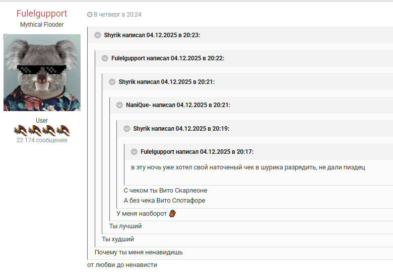 dispersion #6460 В среду в 14:52 PIRO48 написал 16 минут назад: dispersion написал 20 минут назад: xaxain написал 21 минуту назад: Eva написал 08.12.2025 в 22:34: Нам надо сегодня выгнать мафию экви и от известного черного цвета плясать ева выкупил что в игре есть в столе черный чек экви в соло втанчил его и опять словил пулю при том что я спецом свой чек маскировал Если я правильно понял - еву убивали в первую ночь это еще почему Читай абилку сапера, который еву убил Думаю это не с4, потому что нахуй на еву вместо хахаина с4 тратить Цитата Я, dispersion, чмырю активов(аче они дауны ну?) Скрытый текст Поделиться сообщением Ссылка на сообщение