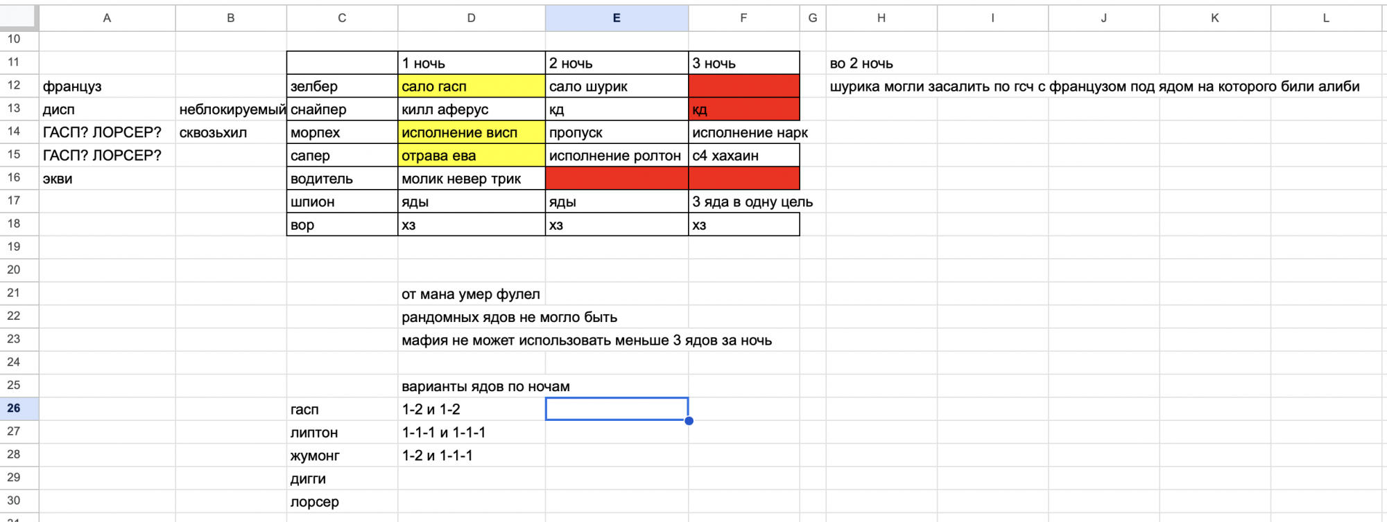 ЖУМОНГ #8795 7 часов назад _diXon написал 7 часов назад: Bararym написал 7 часов назад: _diXon написал 7 часов назад: Bararym написал 7 часов назад: _diXon написал 7 часов назад: @Lorcer ответь на мой вопрос - это важно ЕСЛИ ТЫ ВОЗМОЖНЫЙ ГИПОТЕТИЧЕСКИЙ КЛЕТОЧНИК было ли в 1 или 2 день что тебе ведущий сказал что надо среди 3 ников абилку использовать? или все твои цели были единственные в которые ты кидал? ЭТО ВАЖНО ДЛЯ ЯДА так было 3 ночи сегодня 3 кинули в одну цель точно это обяз условие для запуска типо? да вот я табличку прикидываю с вариантами есть хуйня в том что могли в теории травить 2 ядами француза и он попал салом в шурика по гсч тогда в 1 ночь было 3 яда по единичке и скорее всего это все мжи а француза допустим обмазывали в лейт другой вариант это первая ночь неблокируемость на своего морпеха или отраву хз насколько таргетно убивали еву или виспа, может быть килл по гсч был легко то же сало могло тоже быть по гсч закинуто короче бафф диспа не имел смысл водителя - ну вероятность есть, но бред во 2 ночь только сало могло быть под баффом, остальное било в таргет пока четких выводов нет, но теоретически гасп мог быть сапером который пробивал блок от сала другой вопрос что у нас 4 отравленных помимо того кто получил 3 яда сегодня @Lorcer если ты клеточник - были ли у тебя ходы когда надо было выбрать среди 3 целей ход? ура я нашла эту хуйню получается морпех сегодня чилил, вор исполнял, сапер подкладывал бомбу остались сапер и вор, шурик может быть только вором не обращайте внимания, это я себе пометки делаю, раз мой эчпочмак погиб Цитата Your desire is your essence. Поделиться сообщением Ссылка на сообщение