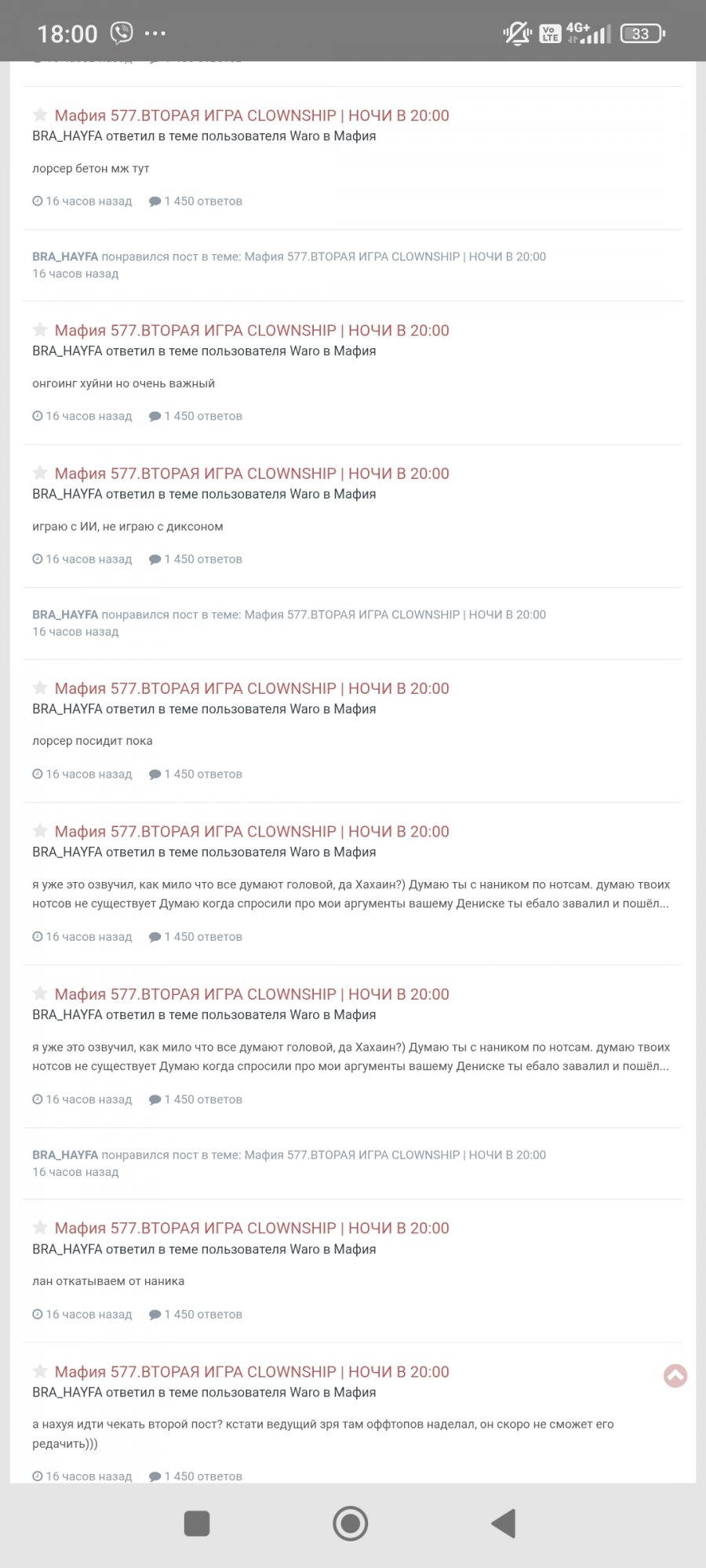 InRo #1448 1 час назад Я вот чего думаю. А смысл мафии сидеть-пердеть в стул и копаться в архиве часами, если серьезно? Чет искать для себя важно мжу, какие-то паттерны в поведении или геймплее. Маф максимум может поактерить и в тупую покликать по темам, тип погружен в поиск, нет времени вас читать/писать. Поэтому осталось, узнать у Хайфы что конкретно он искал и что нашел, если будет 0 инфы и рофлы в ответ, тоже можно выносить товарища Цитата Поделиться сообщением Ссылка на сообщение