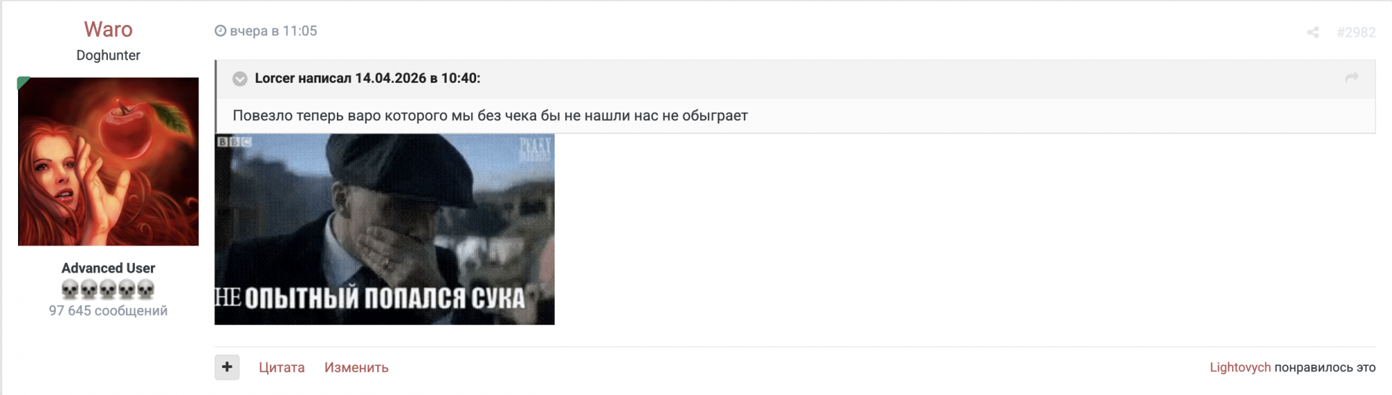 PIRO48 #5815 1 час назад Waro написал 12 минут назад: тут надо смотреть кто этот тупой маяк мог найти и сыграть по нему ева, ролтон, экви - больше я представить не могу можно вообще забить хуй на него в целом если не ты то это просто совпадение Цитата Поделиться сообщением Ссылка на сообщение